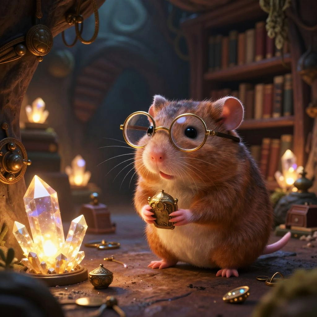 A cute alien hamster sitting on Io in a whimsical, surreal digital art style. Rendered with vibrant colors and surrounded by a surreal landscape featuring lava geysers, molten rivers, and fiery crystal formations. The hamster has detailed, fluffy fur and sparkly, expressive eyes, giving it an adorable, playful look. The setting has a space atmosphere, with futuristic elements and vibrant lighting. This high-quality fantasy piece captures the charm and whimsy of an alien planet with a cute and lovable character.
