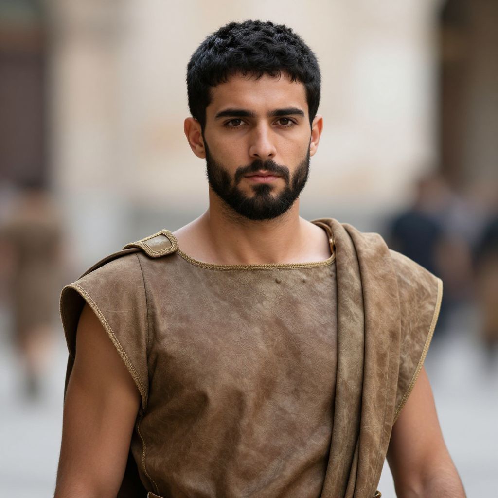Photograph of a muscular, bearded man with short black hair, wearing a sleeveless, brown, ancient Roman-style tunic, standing in a