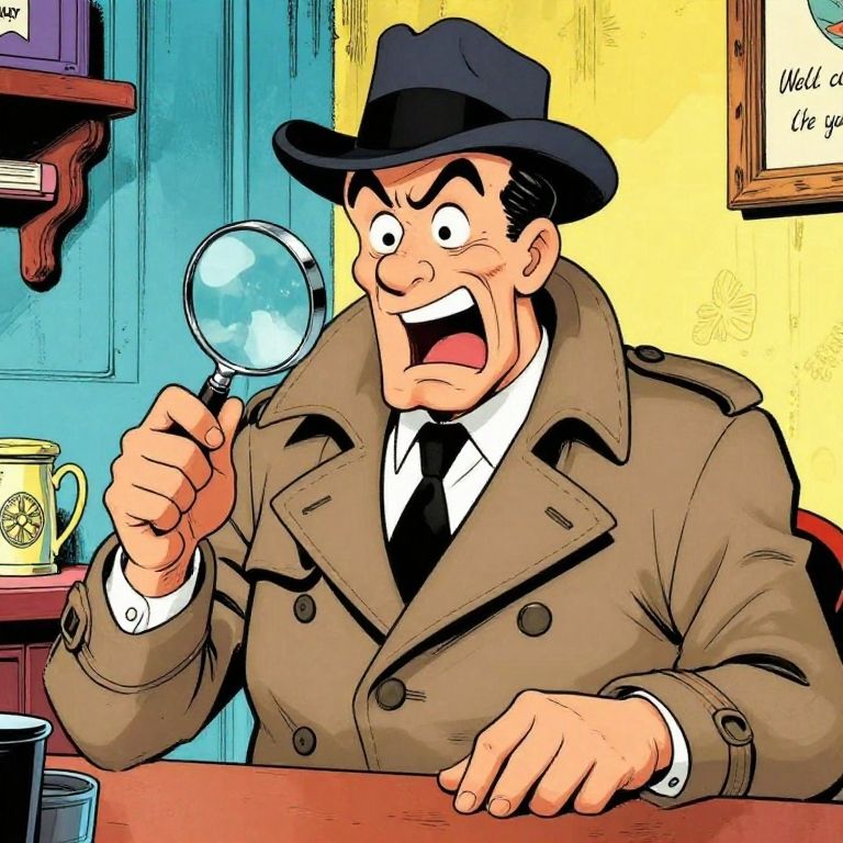 Clouseau-style bumbling detective character, exaggerated facial expression, classic trench coat and magnifying glass, colorful comic book scene, playful and vibrant palette