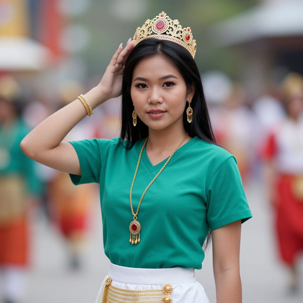 Photograph of an Asian woman with black hair in a white flower bun, wearing a light blue blouse and colorful striped skirt, standing on stone steps in