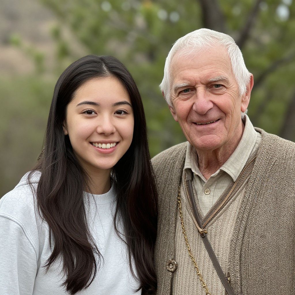 Photograph of an elderly white man with short white hair and a light brown cardigan over a beige shirt, standing next to a young Asian woman with long black hair and a white long-sleeve shirt. Both are smiling, with the man's expression gentle and the woman's bright. The background is blurred, showing green trees and a hint of a hill, suggesting an outdoor setting. The lighting is natural, and the image has a slight HDR effect, enhancing colors and details.