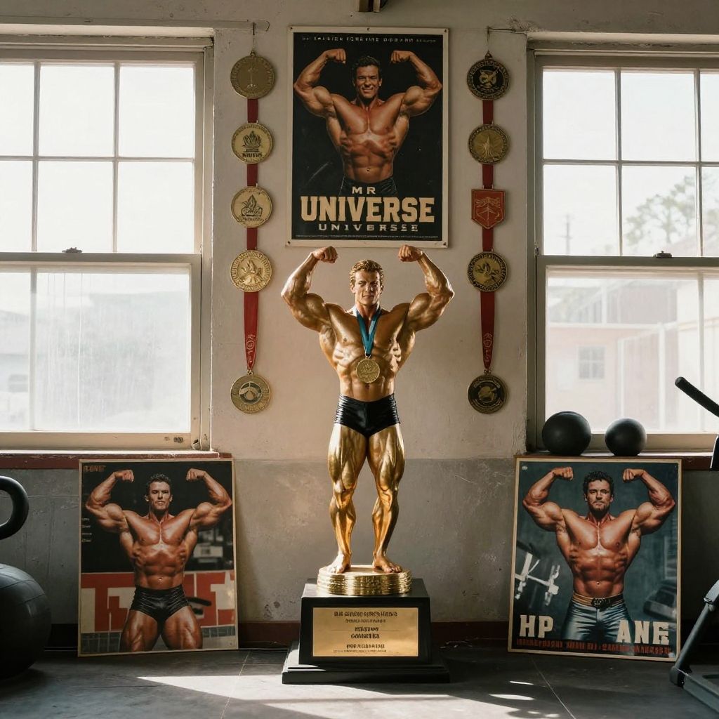 Mr universe trophy surrounded by classic bodybuilding posters and medals on a gym wall, vintage style, natural light streaming through dusty windows, nostalgic and inspiring scene