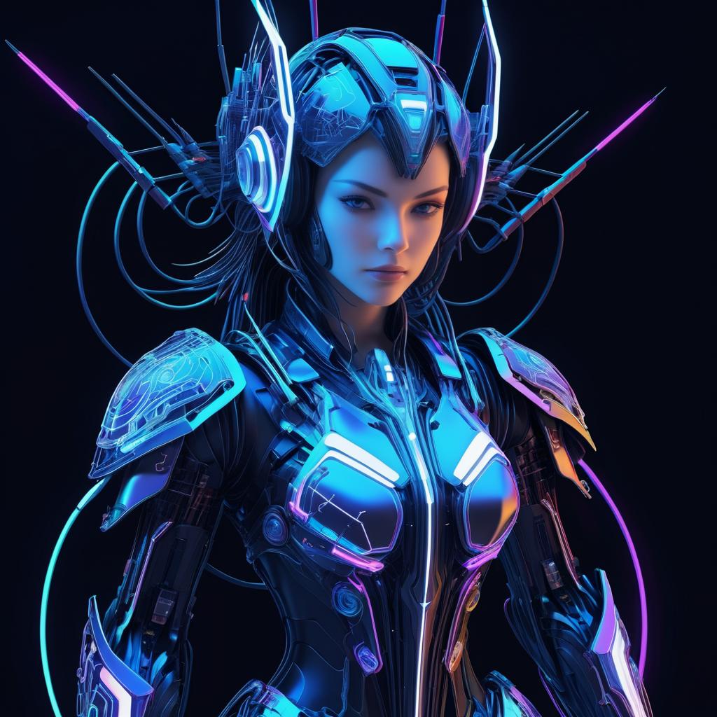 Organically connected to a dark wall of luminous circuits and computer electronics with tubes and cables and tubes and fiberoptics is a beautiful 3 d body of a robot fighter pilot woman mostly made of wires and electronic circuits led luminous with shiny metal parts, an ultrafine detailed illustration by james jean, final fantasy, intricate linework, bright colors, behance contest winner, vanitas, angular,