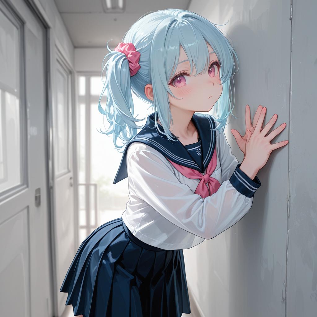 Best quality, masterpiece, 1girl, solo, light blue hair, pink eyes, side ponytail, serafuku, pleated skirt, detailed hands and fingers