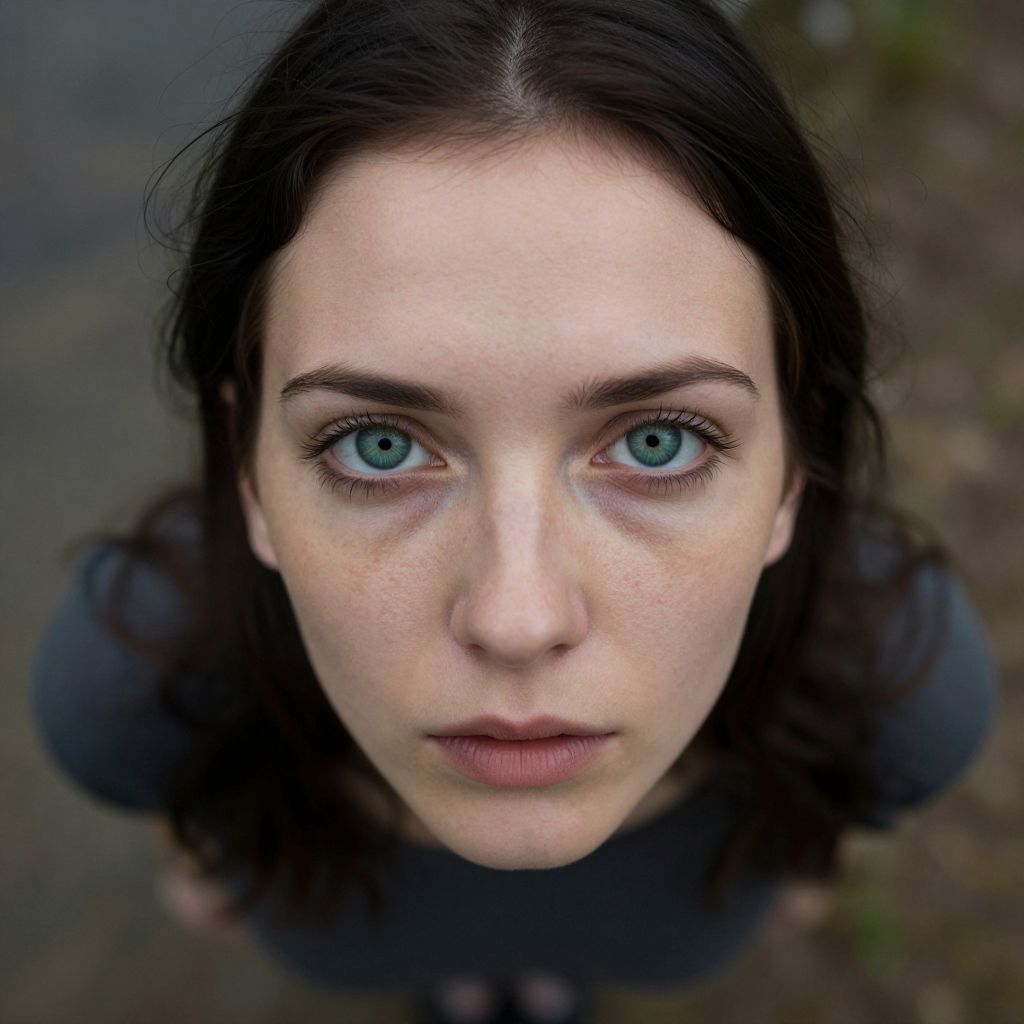 A photorealistic portrait depicts an enigmatic Eastern European woman with captivating emerald eyes and raven hair, captured from a unique worm's-eye view perspective. The intricate details of her delicate features and subtle freckles are emphasized by the soft play of light on her skin. This captivating image balances intense realism with abstract elements, evoking a range of emotions from intrigue to introspection. Standing resolute amidst an ethereal landscape that blurs reality and dream, she invites viewers to delve into the depths of her soul.