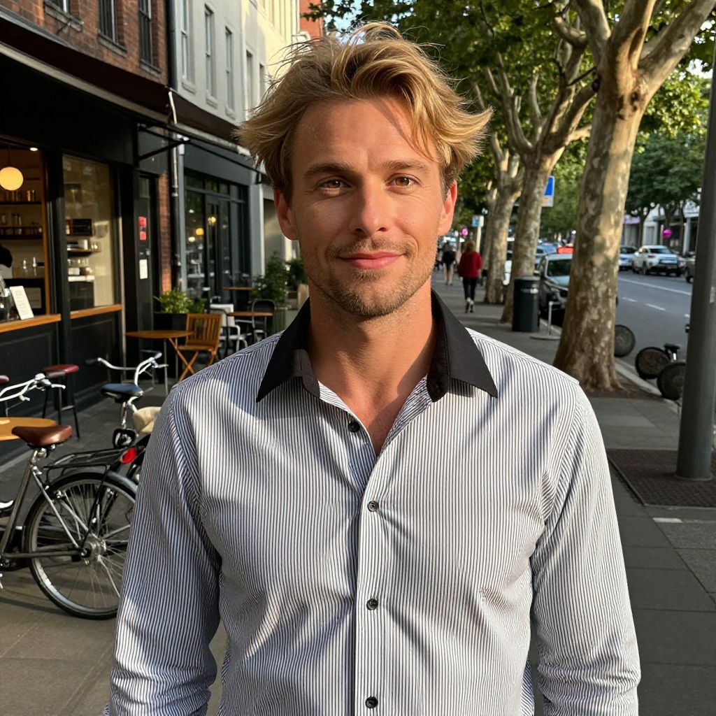 A confident man with tousled blonde hair, warm brown eyes, and a subtle smile, wearing a well-fitted white and black striped shirt with a crisp black collar, standing in a sunlit urban setting filled with vibrant street life—such as parked bicycles, a nearby coffee shop, and a tree-lined sidewalk. He exudes a relaxed yet stylish demeanor, with soft sunlight streaming through the cityscape, casting gentle, golden shadows across his face and the surrounding environment. The atmosphere is calm and inviting, highlighting his composed presence and effortless charm.