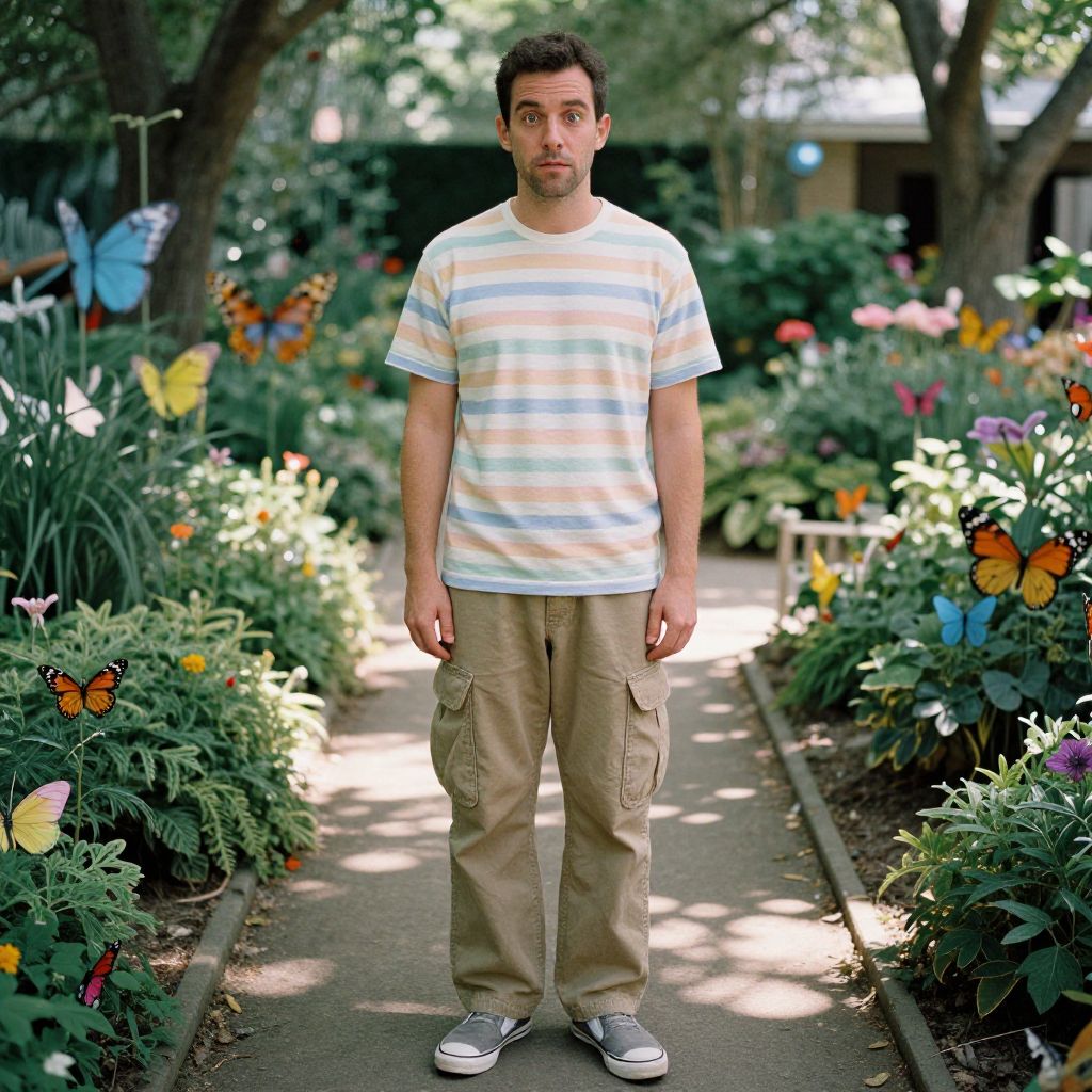 A man, retro-inspired pastel striped tee, faded khaki cargo pants, slip-on canvas shoes, vintage aesthetic, colorful butterfly garden, sun-dappled pathways, Holga camera style, soft focus, playful expression. Man has masculine face and piercing eyes