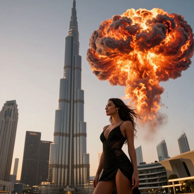 Oneness An female influencer doing a photoshoot in Dubai, Burj Khalifa::3 in the background, nuclear blast mushroom cloud, warm fire colours, ultra-realistic, precise details,