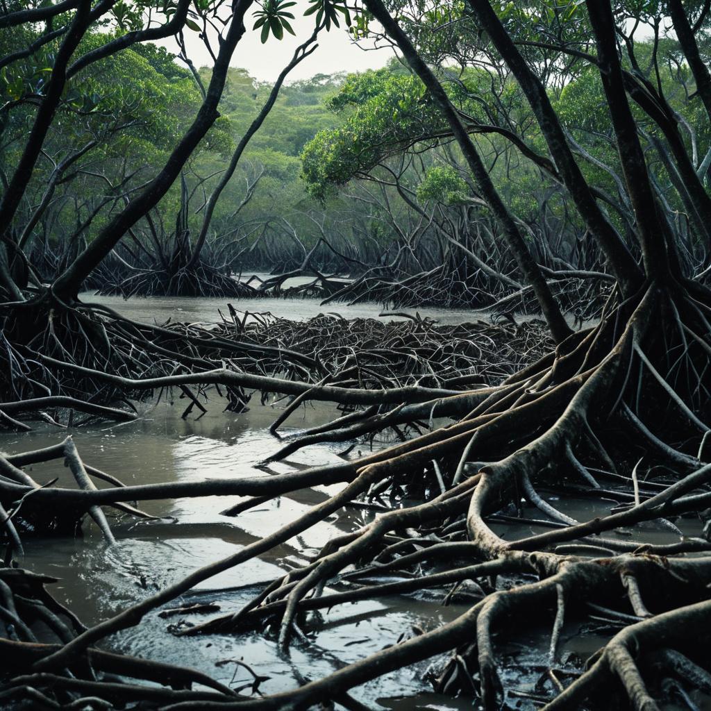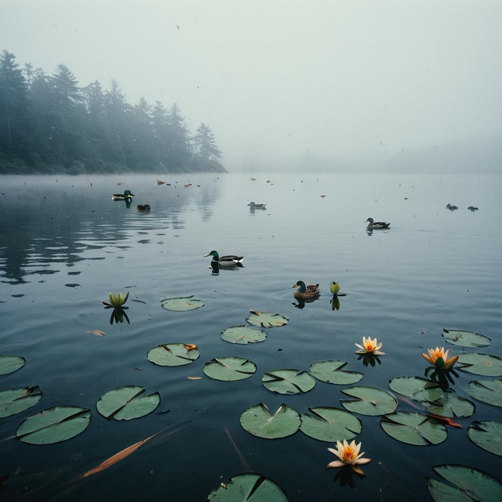 Rhombus wide shot of misty freshwater lakes, lilies floating on water surface, ducks swimming calmly, violent ocean, early morning fog, moody, cinematic, detailed and intricate.