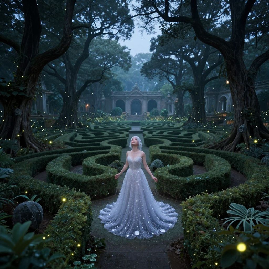 A photograph depicts a fair-skinned woman with blonde hair in a white, strapless, sparkling ball gown standing in the center of a dark, enchanted garden. The garden features meticulously trimmed hedges forming a maze, surrounded by tall, shadowy trees. Small, glowing fireflies illuminate the scene, creating a magical atmosphere. In the background, an elegant, classical building with arched windows is partially visible through the trees. The woman's gown has a long, flowing train that fans out on the ground, and she stands with her arms slightly outstretched, looking forward with a serene expression.