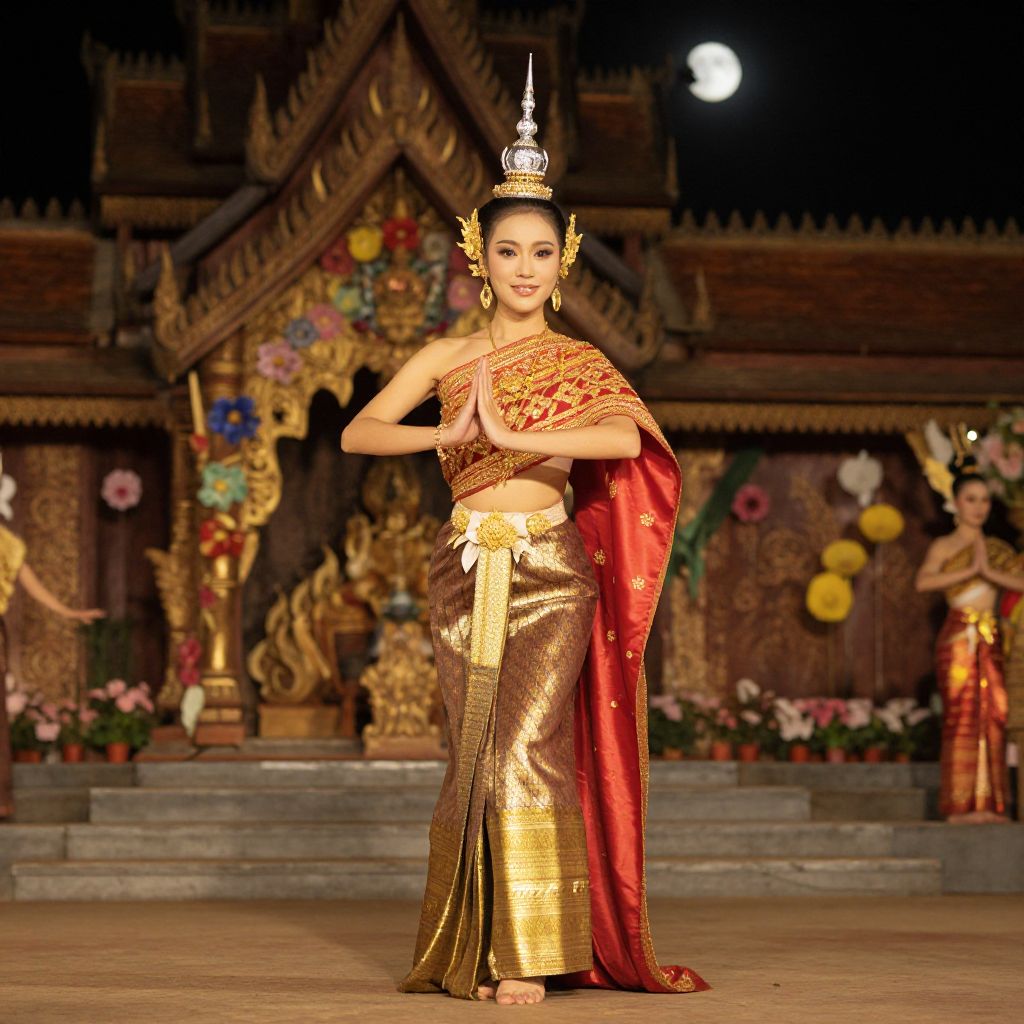 A graceful Thai dancer in a flowing silk red and gold traditional outfit, standing center stage in a vintage-style outdoor theater under soft moonlight, her ornate gold headpiece catching the silver light with elegant detail, her face beautifully sculpted with warm skin and a faint smile, the background showing a backdrop of traditional Thai architecture and floral decorations.