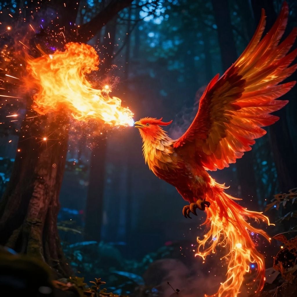 Breathing fire firework fantasy scene featuring a phoenix releasing flaming fireworks from its beak, colorful sparks illuminating a mystical forest, highly detailed and vibrant