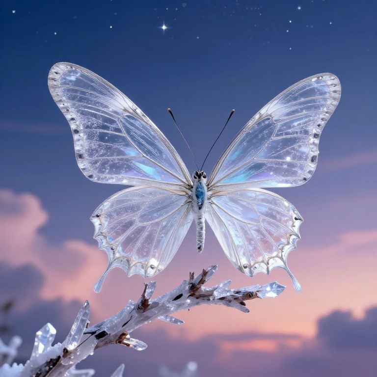 Vutterfly perched atop a crystalline branch, wings composed of delicate glass and shimmering metal filaments, background of a twilight sky filled with stars and softly glowing clouds, blending fantasy and sci-fi elements, hyper-realistic detail.