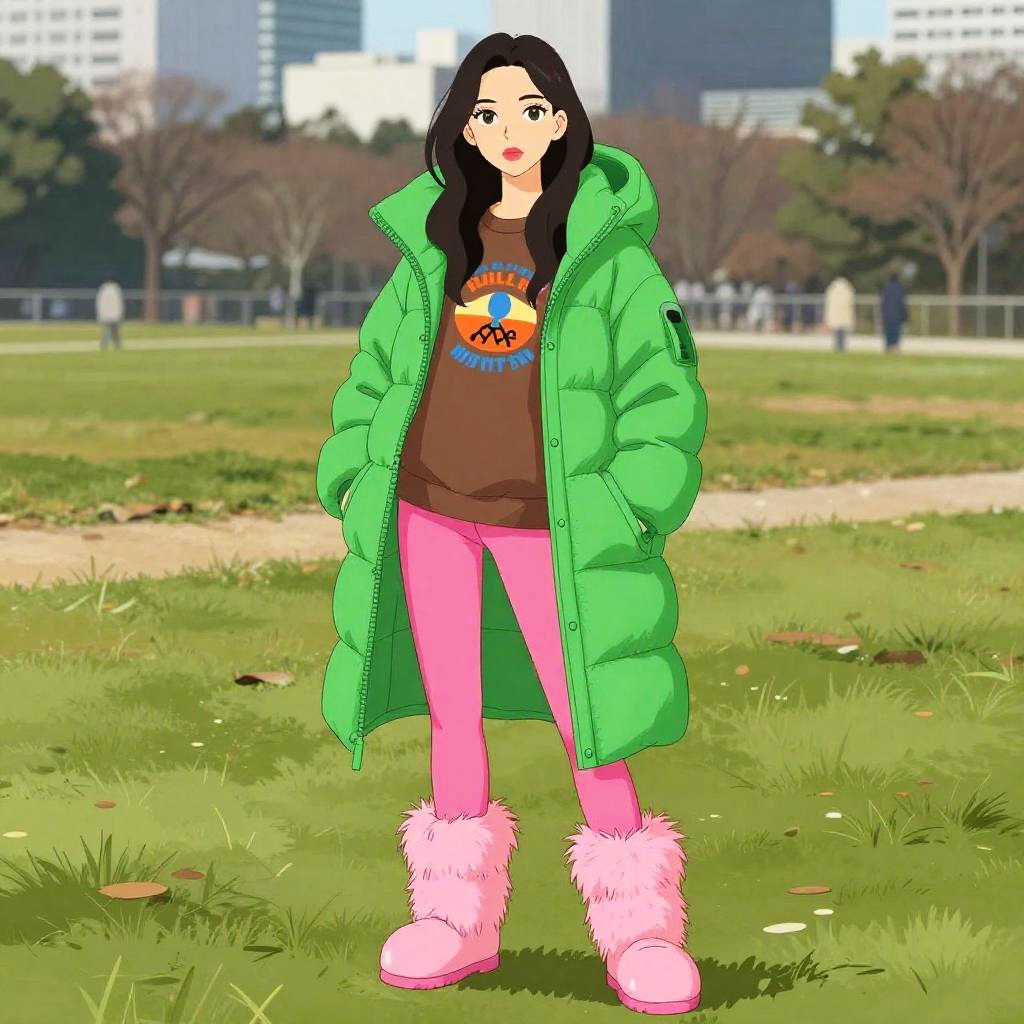 A woman in streetwear, wearing a bright green puffer coat with an oversized hood layered over a brown graphic sweatshirt, hot pink fitted pants, and pink faux fur boots, standing in a city park open field, illustrated in the vibrant style of Kyoto Animation. Sexy. Pretty face and beutiful eyes