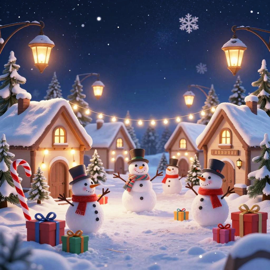 Whimsical Christmas background featuring a cozy snowy village with twinkling fairy lights, playful snowmen, candy cane trees, and colorful presents scattered around, all set under a starry night sky with soft glowing lanterns and snowflakes gently falling.