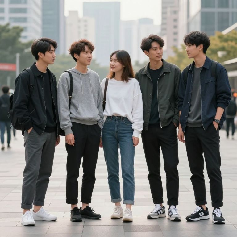 Casual street outfits, stylish yet comfortable, diverse group of friends, modern cityscape background, soft natural light, candid street photography style