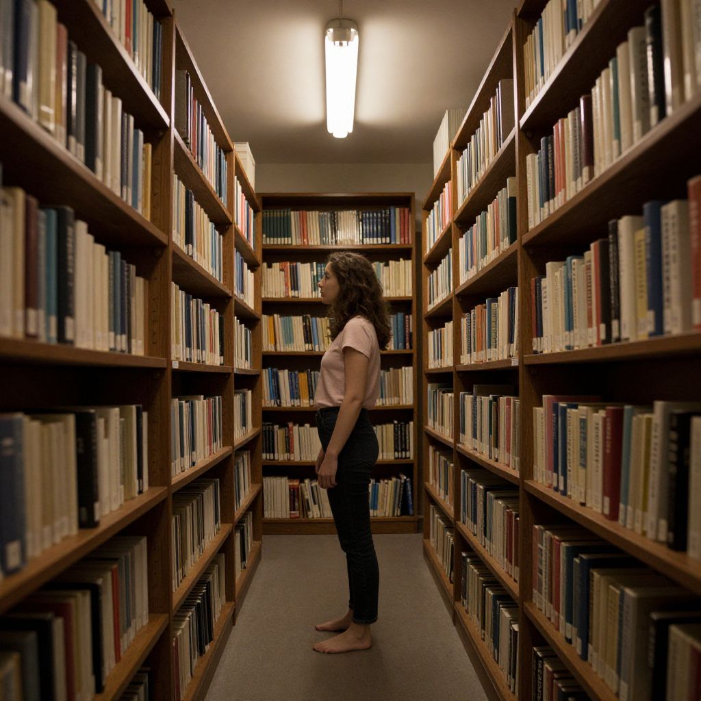 Woman stands barefoot in a dimly lit library aisle, surrounded by towering wooden bookshelves filled with neatly arranged volumes under a solitary fluorescent light overhead.