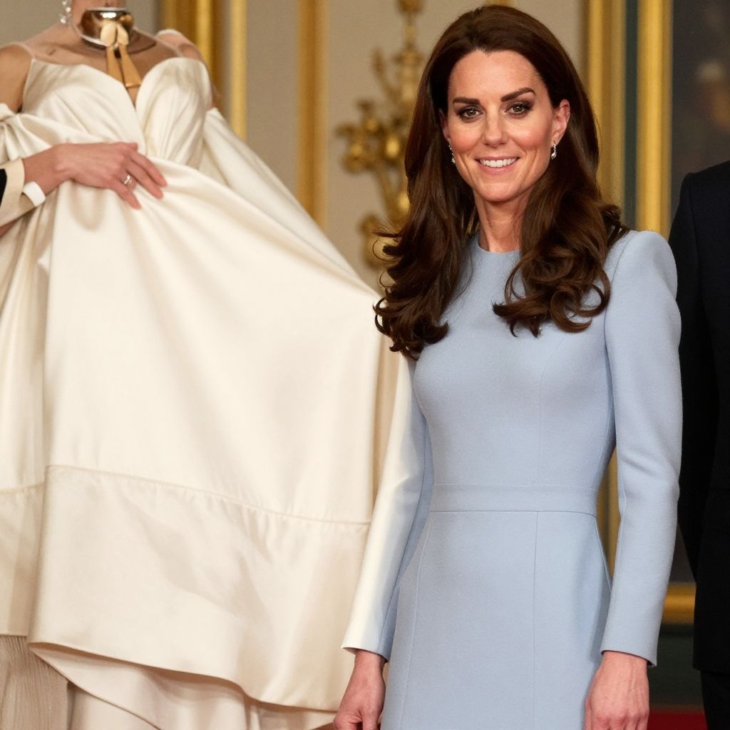 Photograph of an elderly white woman with short, curly white hair wearing a silver tiara adorned with a large purple gem. She has fair skin and is dressed in a light blue, textured, knee-length dress with a pearl necklace, matching earrings, and a brooch. Her expression is composed, with slightly parted lips. In the blurred background, an older white man with short gray hair, dressed in a black suit with a white shirt and black tie, stands. The background features a wooden panel and neutral-colored walls.