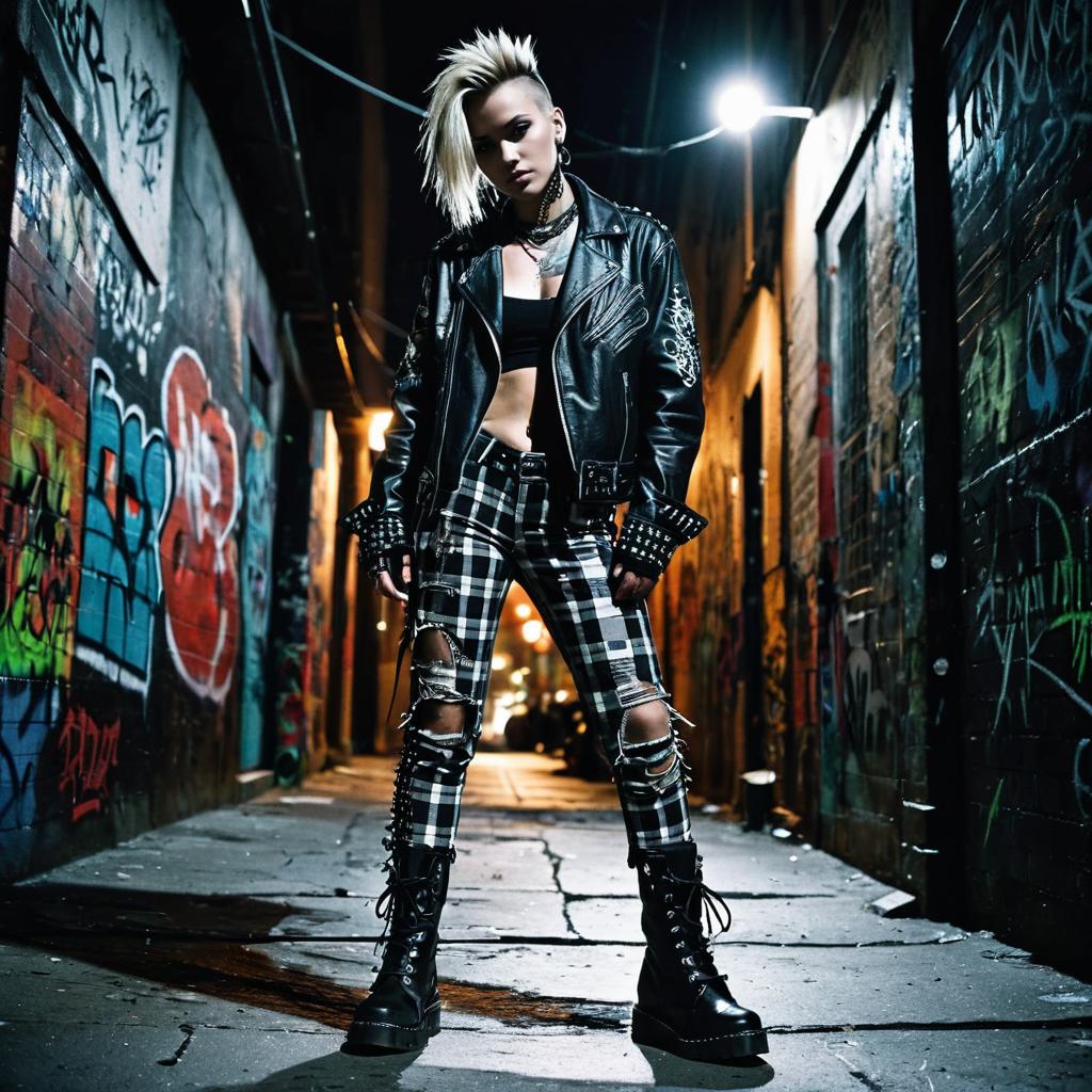A pierced punk rock musician stands confidently in a graffiti-covered urban alley at night. She wears an oversized black leather jacket with studded cuffs, black and white plaid ripped pants, fingerless gloves, and high studded combat boots. Her platinum blonde mohawk hairstyle and dramatic moody lighting highlight her street style aesthetic. The alleyway is filled with colorful graffiti and subtle street lights accentuating a high-detail night photography vibe.
