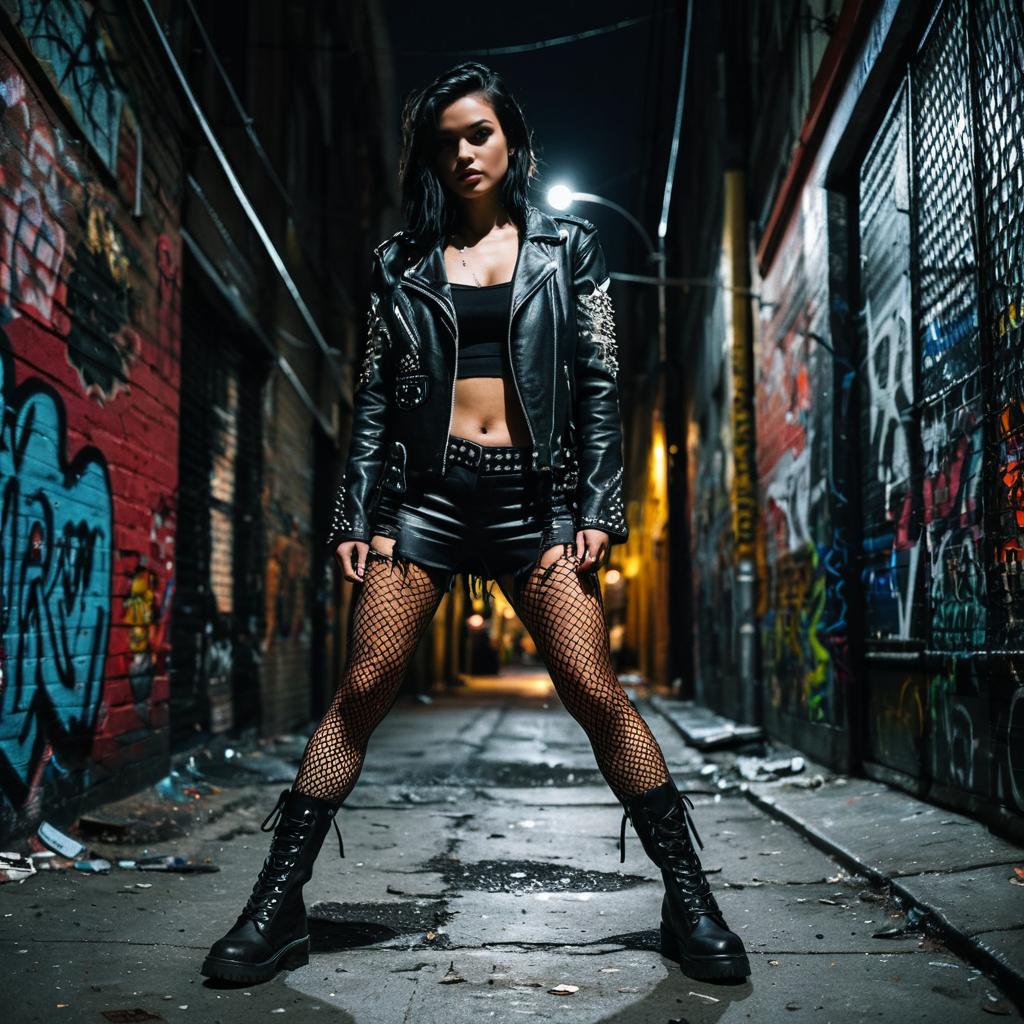 In a graffiti-laced urban alley at night, a pierced punk rock musician wearing oversized leather jacket, plaid pants, studded combat boots, and ripped fingerless gloves is illuminated by dramatic moody lighting, captured in high-detail street style photography.