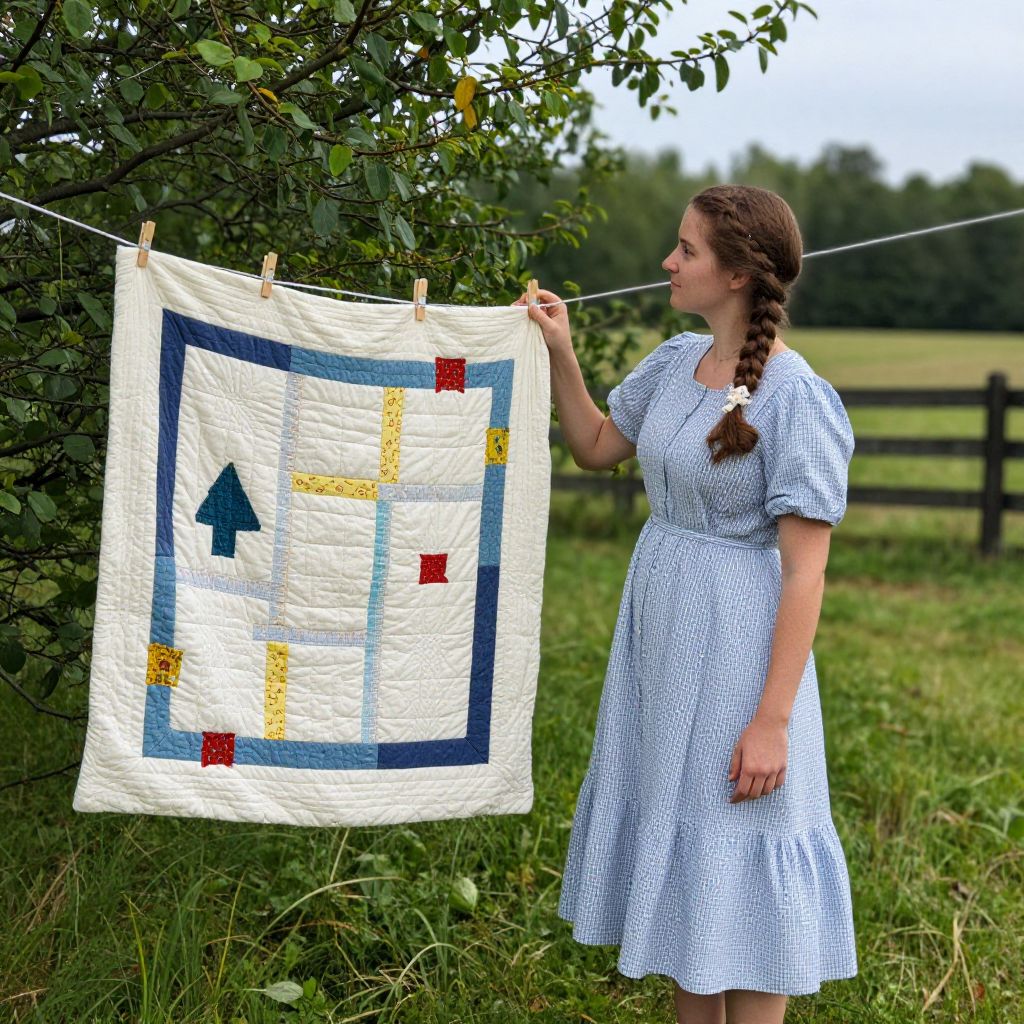 A farmwoman in house dress outside, with quilt she made hanging next to her from a clothesline.