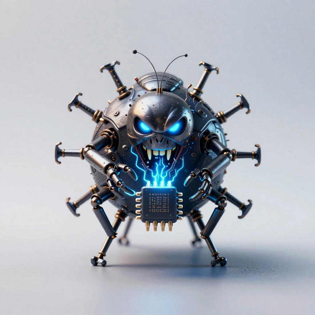 This is a digital illustration of a futuristic, robotic virus-like creature. It has a metallic, spherical body with multiple mechanical arms protruding from its circumference. The creature's eyes glow bright blue, and its open mouth reveals a fiery blue interior, giving it a menacing appearance. A small, detailed motherboard is at its bottom center. The background is a gradient of white to light blue, emphasizing the creature's metallic and glowing elements. The overall style is high-tech and sci-fi, with a focus on sharp, metallic textures and vibrant, glowing features.
