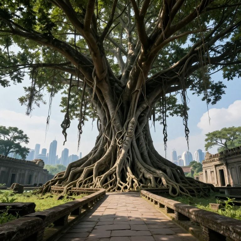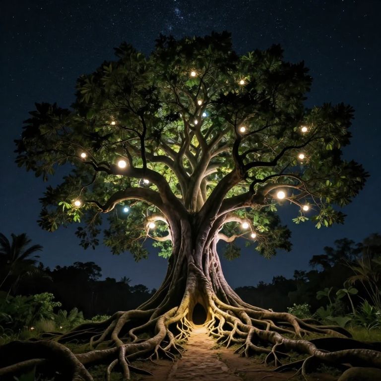 Giant tree with a glowing hollow interior draws a group of people who gather around its base, some observing while others venture inside along a path illuminated by radiant light emanating from within.