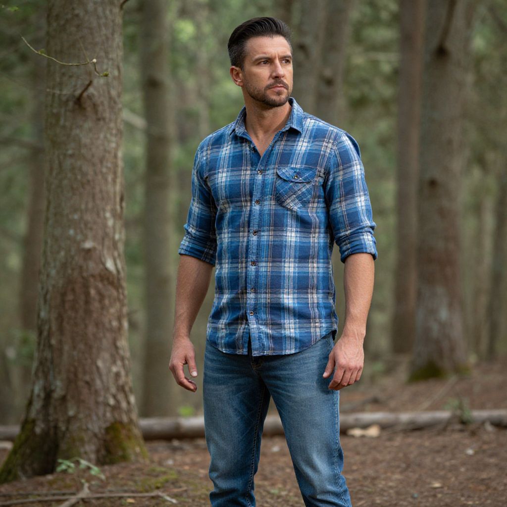 A confident man stands in a serene forest setting, wearing a blue plaid shirt with rolled-up sleeves and fitted jeans. The natural light filters through the tall trees, highlighting the detailed textures of his clothing and the tranquil ambiance of the woodland environment.