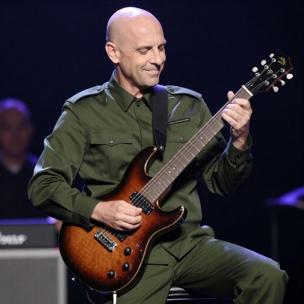 Photograph of a bald middle-aged man in a military-style green uniform playing a large, shiny electric guitar with a distinctive teardrop body. He is seated, smiling, with one hand on the neck and the other on the body of the guitar. The background is dark with blurred, indistinct objects.