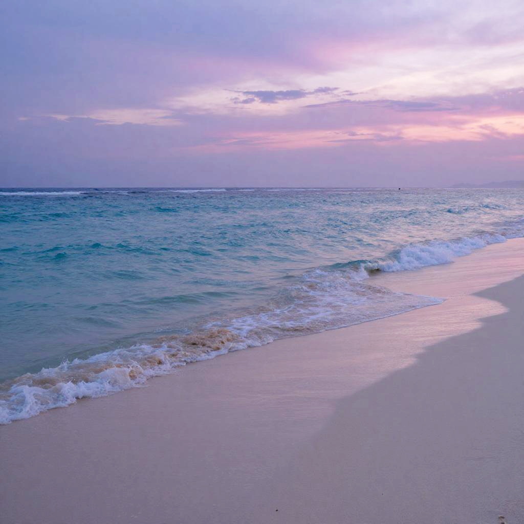 Dreamy scenery showing a quiet beach with turquoise waves gently lapping shore, twilight colors blending pinks and purples, serene and otherworldly vibe