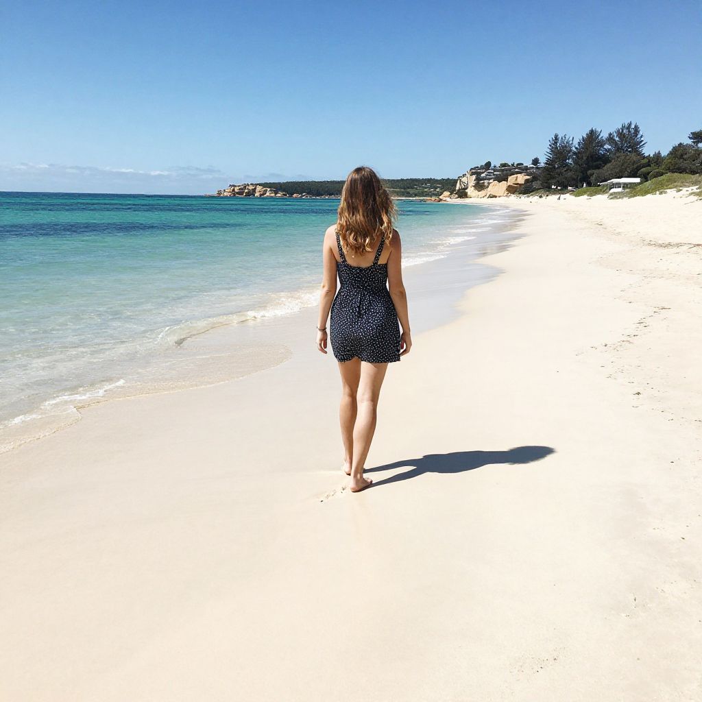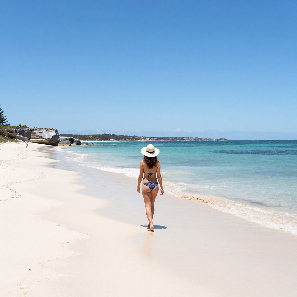 Woman walking barefoot along a pristine sandy beach at Rottnest Island, Perth, with turquoise waters and distant cliffs under a clear blue sky.