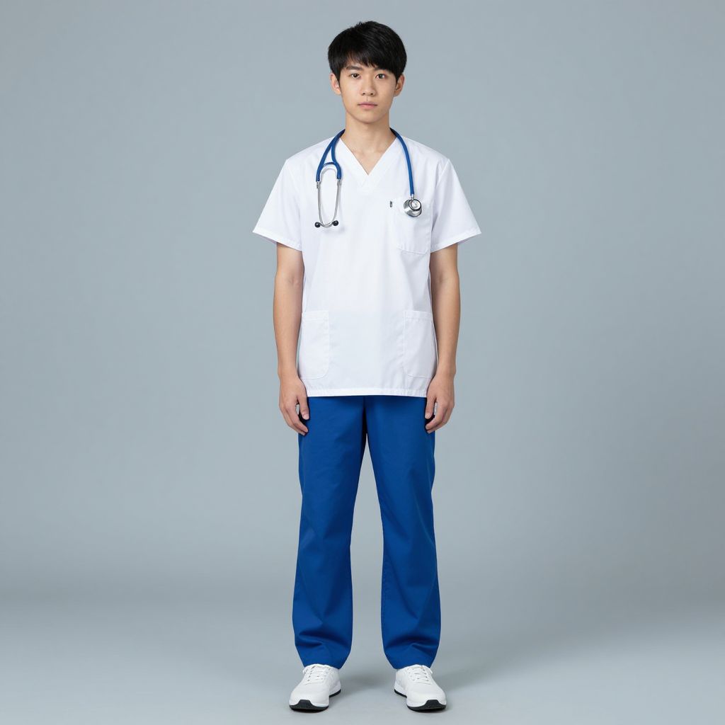 Scrubs clothing costume, 1boy, stethoscope, male focus, solo, doctor, realistic, full body, standing, shoes, shirt, white shirt, looking at viewer, asian, black hair, pants, hospital gown, sneakers, short sleeves