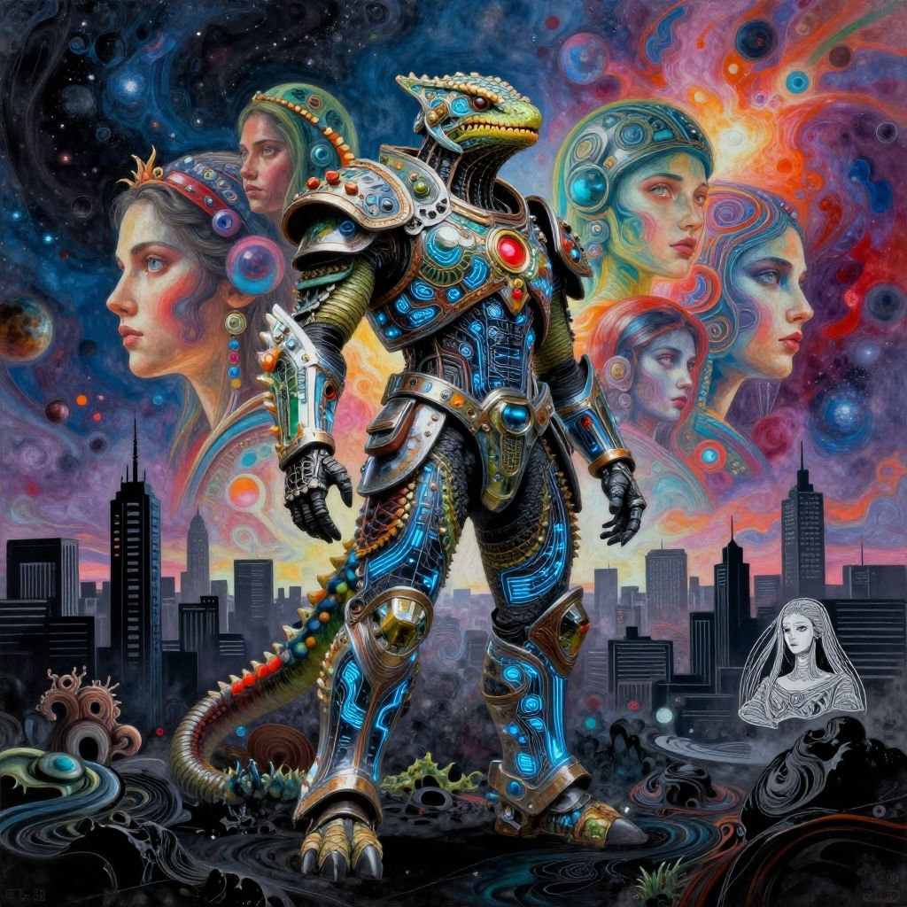 ((masterpiece, high quality, best quality, 8k, wallpaper, fine lineart, highly detailed, absurdres)), cinematic photo magical style land art style hyperrealistic, ( vaporwave:1.3), vivid colors, intricate details, realistic style, oil paintings, acrylic paintings, watercolor paintings, digital illustrations, mixed media pieces, sculptures casting shadows, cosmic sky, photorealistic, extreme detail, lifelike, crisp, precise. natural materials, outdoor, detailed blend of organic and magical elements, futuristic, legendary, detailed, intricate, skin texture, film, bokeh, professional, 4k, in the style of art, colorful, ( black skyline:1.5), ( dark tar on black:1.6), glass on black, exquisite, faces of the future, ( helmet:1.2), ( full body:1.4), reptile armor, heavy armor, ( illuminated blue prints:1.2), tron blueprints, ( wireframe:2.5)