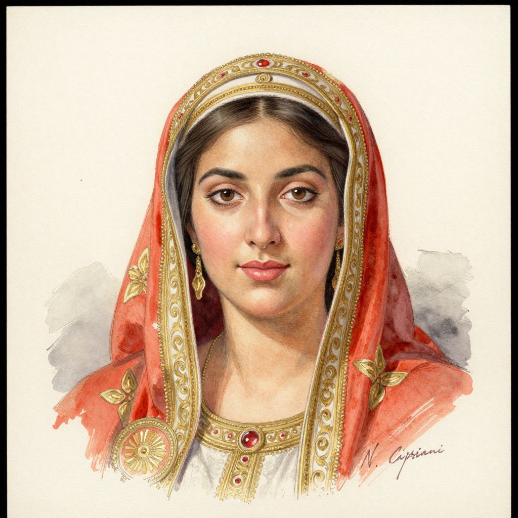 Digital drawing of a South Asian woman with fair skin and dark brown hair. She wears a red, gold-embroidered headscarf adorned with red and blue gemstones, and a matching outfit with intricate gold and red patterns. Her brown eyes are slightly almond-shaped, and she has full lips with a subtle pink hue. She wears a gold headpiece with a central red gem, and a large gold earring in her right ear. The background is white with subtle watercolor textures. The style is realistic with detailed, vivid colors and fine textures, emphasizing traditional South Asian attire.