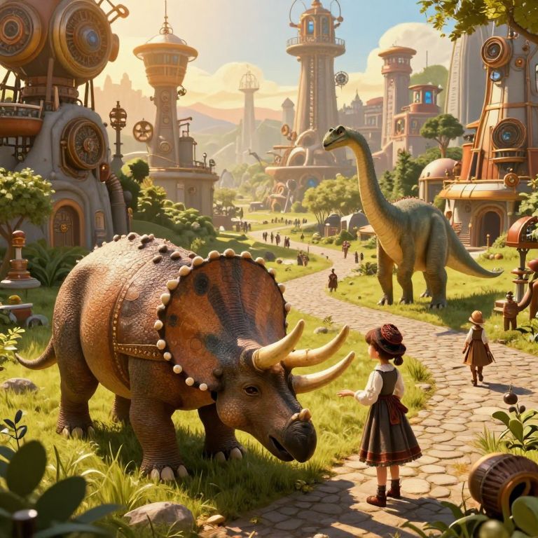 Create an enchanting scene depicting a harmonious blend between humans and prehistoric creatures in a world where nature and technology are seamlessly intertwined. Picture a bustling steampunk-inspired cityscape with intricate mechanical structures towering over winding cobblestone streets and lush greenery, all bathed in warm golden sunlight. From a unique elevated perspective, observe the serene Triceratops grazing peacefully in the foreground as it shares its environment with a young girl dressed in Victorian attire who is engaged in an intriguing interaction with a curious Iguanodon in the background. This captivating scene should evoke feelings of wonder, curiosity, and adventure, transporting the viewer to a world where the impossible becomes possible, much like the imaginative landscapes painted by James Gurney's \"Dinotopia\" series.