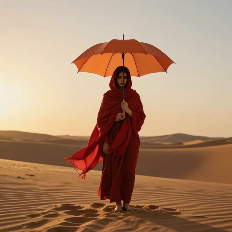 A digital artwork featuring a solitary figure standing on a vast desert landscape, draped in a flowing red scarf and holding an orange umbrella, evokes a surreal and contemplative mood, blending the emotional symbolism of jealousy and nostalgia with the serene beauty of the golden hour lighting.