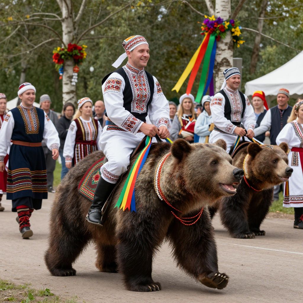 Russians riding bears during a traditional festival, colorful folk costumes with embroidered patterns, festive decorations hanging from trees, bears decorated with ribbons and beads, joyful expressions, lively scene with dynamic movement, painterly style.