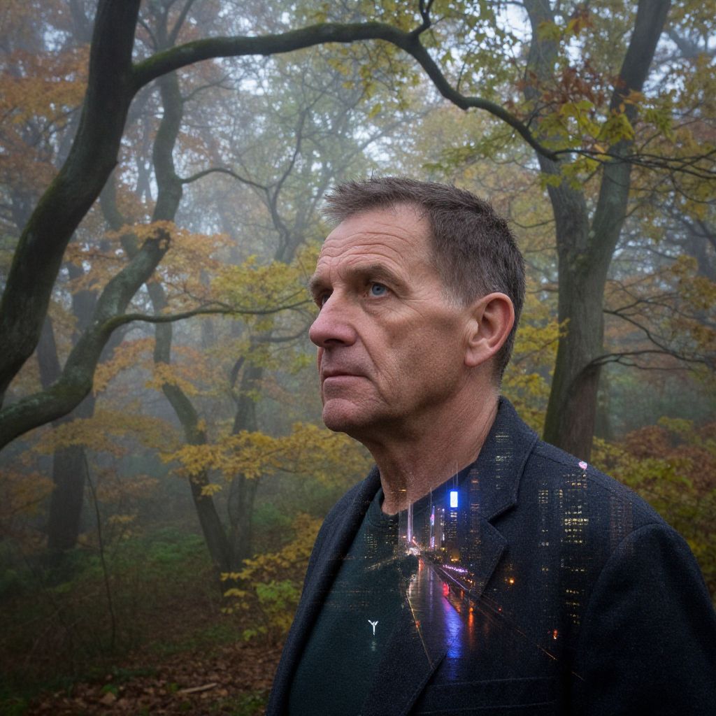 A middle-aged man, his rugged features etched with deep lines and piercing blue eyes, stands amidst a misty autumn forest. The gnarled branches seem to mirror the contours of his weathered face, as if they were one with nature's rugged beauty. He is captured in a moment of contemplation, his silhouette framed by the ethereal light filtering through the dense canopy above. Overlaid upon this serene natural scene are fleeting glimpses of a bustling cityscape at night—neon lights reflecting off rain-slicked streets and distant skyscrapers piercing the darkness. This juxtaposition creates an atmosphere that contrasts solitude with connection, highlighting the transient nature of human existence against the timeless backdrop of the natural world.