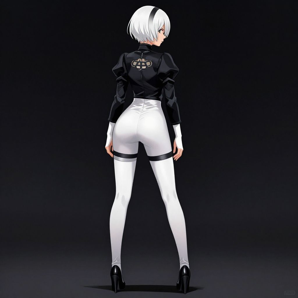 Digital illustration of an anime-style woman with short white hair viewed from the back, wearing a fitted black long-sleeve top and tight white pants, paired with black high heels. The background is dark, creating a dramatic contrast with the figure.