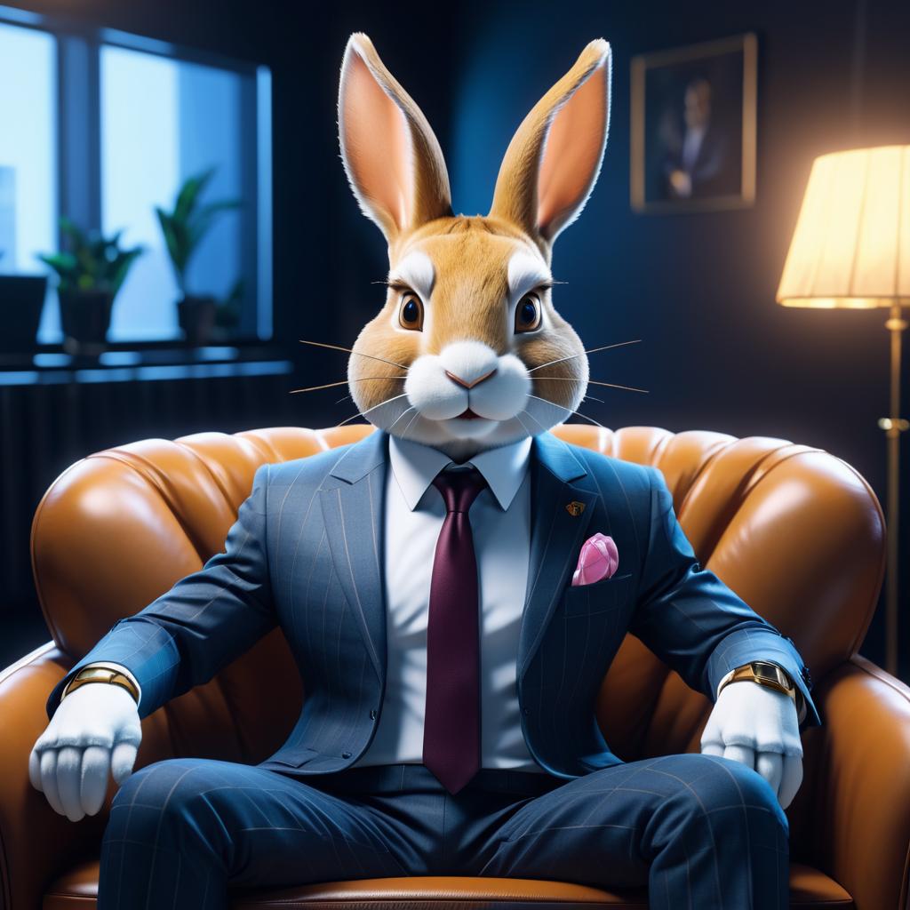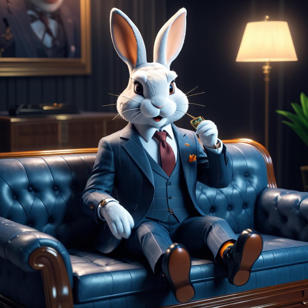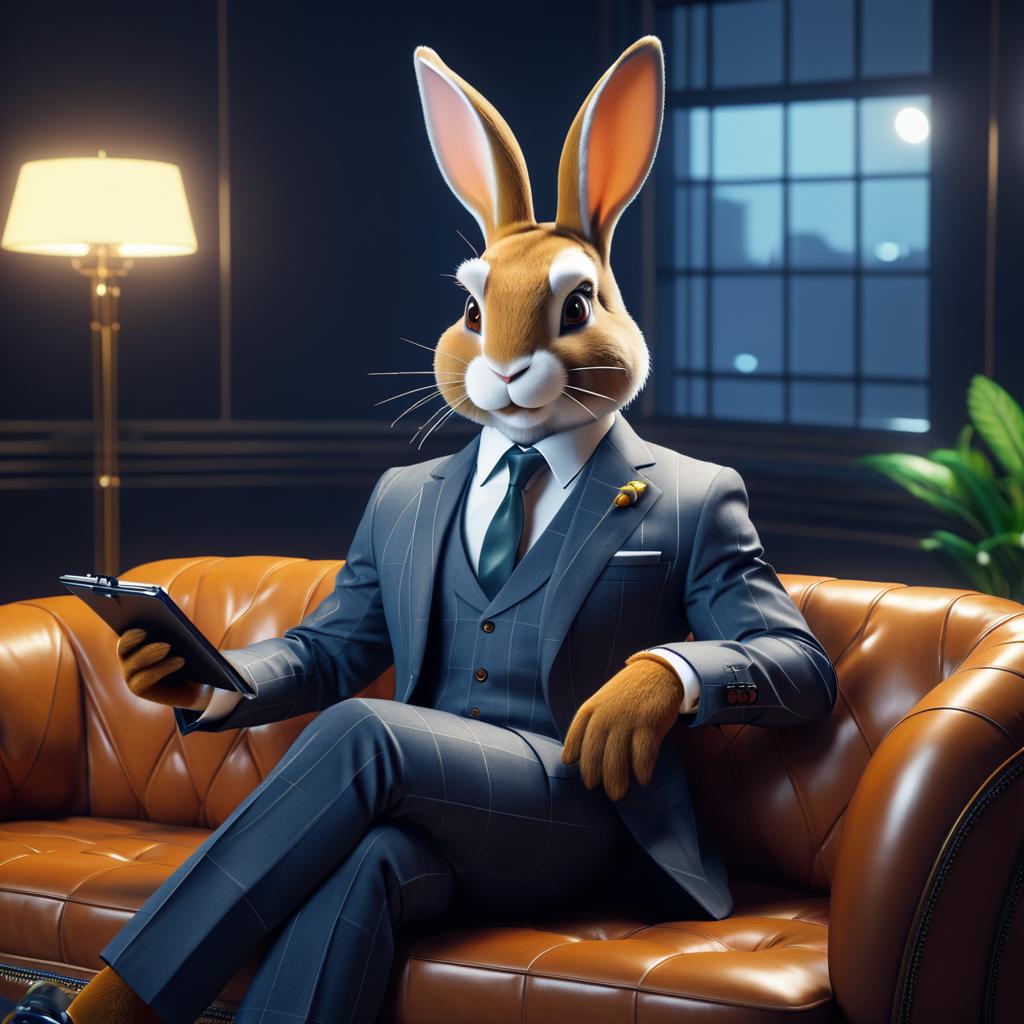 Anthropomorphic rabbit dressed in a sharp, pinstriped blue suit sitting on a detailed brown leather couch in a stylish, dimly lit office. The rabbit wears black gloves and holds a smartphone, exuding professionalism. A classic table lamp and clock adorn the background, with a framed portrait of a similarly dressed rabbit on the wall.