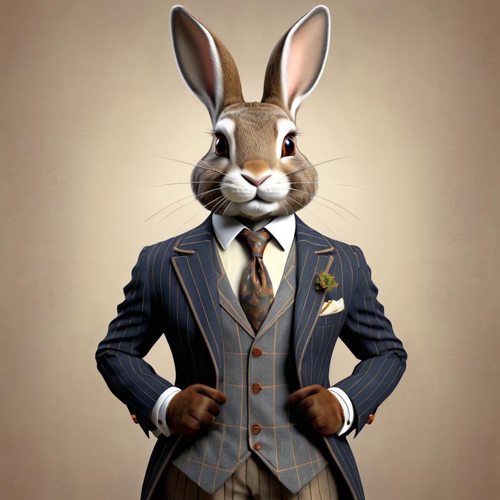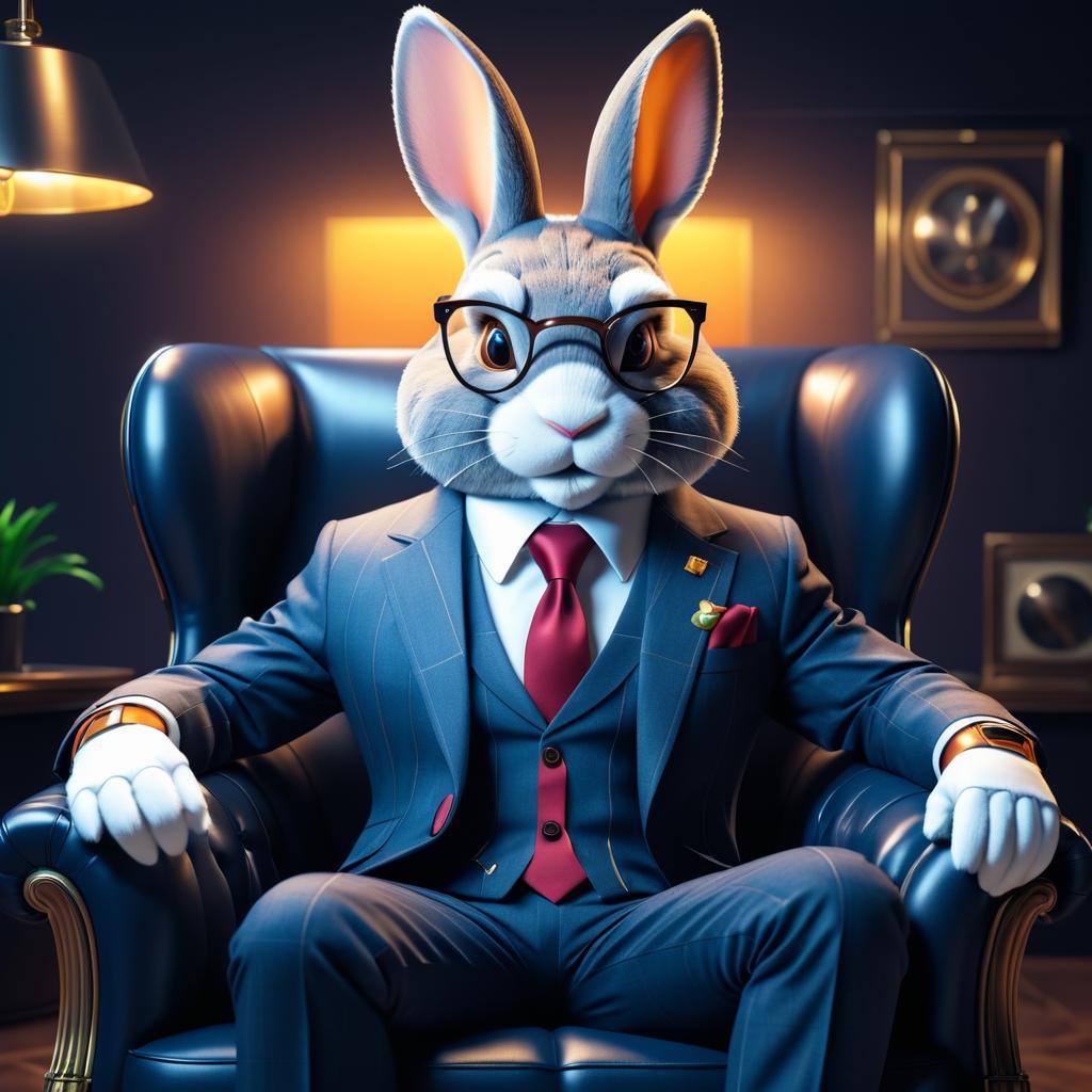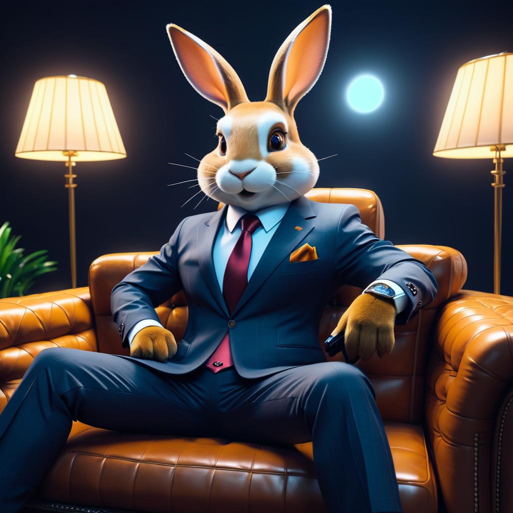 Anthropomorphic rabbit dressed in a sharp, pinstriped blue suit sitting on a detailed brown leather couch in a stylish, dimly lit office. The rabbit wears black gloves and holds a smartphone, exuding professionalism. A classic table lamp and clock adorn the background, with a framed portrait of a similarly dressed rabbit on the wall.