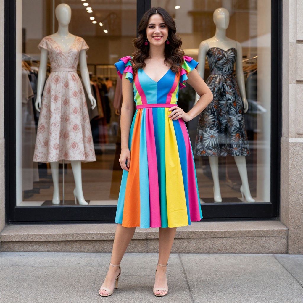 Photograph of a smiling woman with dark, wavy hair standing in front of a store window. She wears a vibrant, knee-length dress with bold, vertical rainbow stripes in blue, pink, yellow, orange, and green. The dress has short, colorful puffed sleeves and a V-neck. She pairs the dress with white, open-toed heels. Behind her, the store window displays two mannequins: one in a pale pink floral dress and another in a black, floral-patterned dress. The store's exterior is made of gray stone, and the background shows a blurred interior with clothing racks. The woman's confident pose and bright dress contrast with the more muted tones of the mannequins and store background.