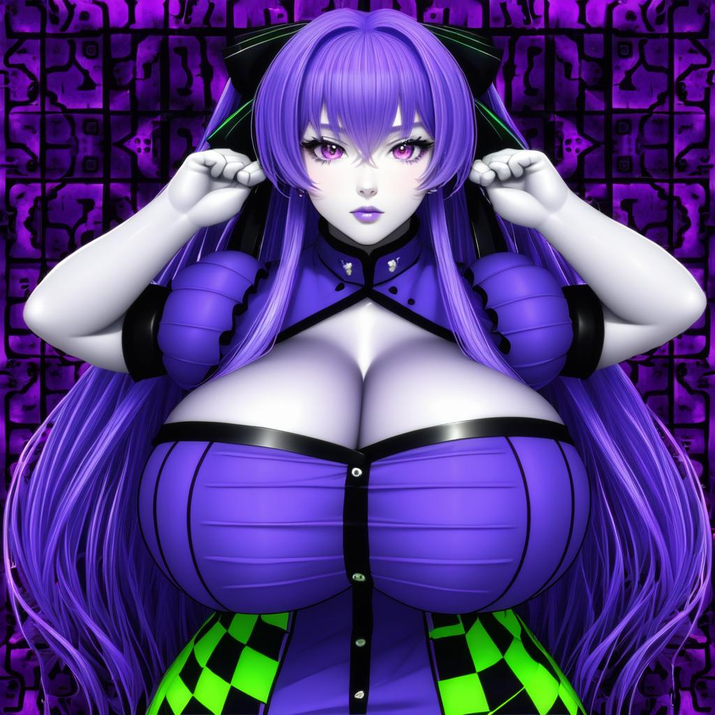 This digital anime-style drawing features a voluptuous woman with long, flowing purple hair and large, expressive pink eyes. She has pale skin and is wearing a tight, purple, low-cut top that accentuates her large breasts. Her outfit also includes a black and green checkered skirt. She is posed with her hands raised to her head, fingers curled near her temples. The background is a dark, abstract pattern with purple and black hues. Her hair is adorned with a large black bow. The image has a vibrant, high-contrast color palette, with a focus on purple and green.