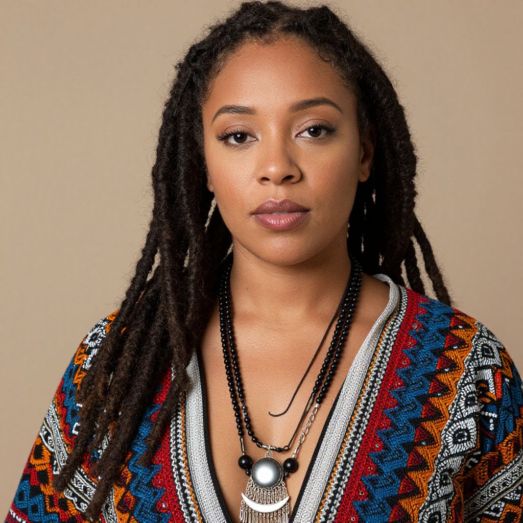 Photograph of a Black woman with long dreadlocks, wearing a colorful, patterned top, layered necklaces, and hoop earrings, against a beige