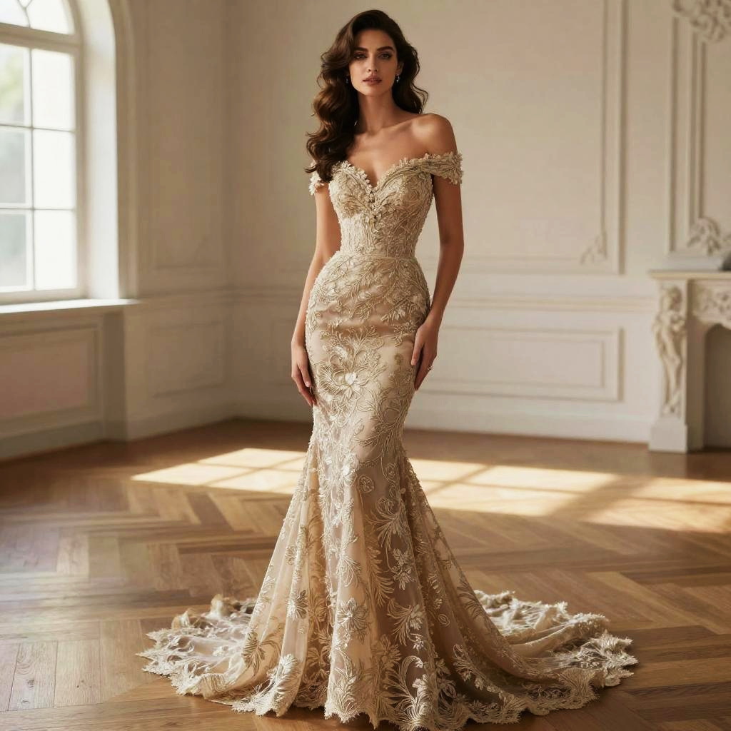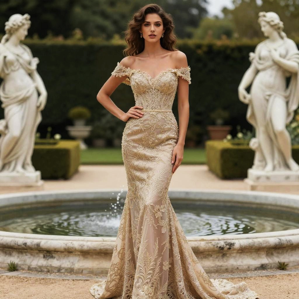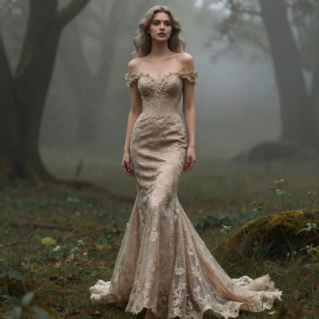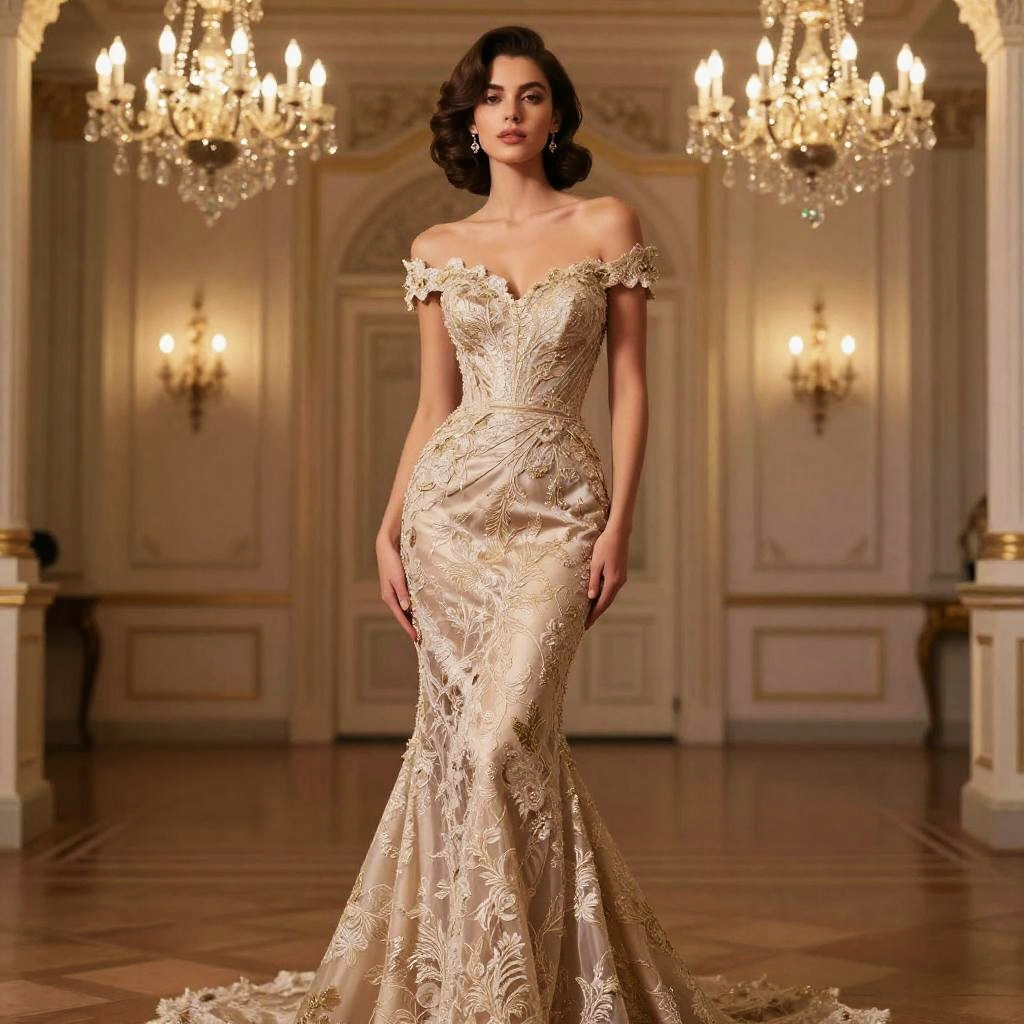 Mysterious woman wearing a vintage cloche hat in foggy Parisian alley, embodying noir cinematic drama, wearing a fitted nude mermaid gown with intricate metallic gold lace overlay, sweetheart neckline, off-the-shoulder cap sleeves; sculpted bodice and cinched waist; skirt flaring from knee to a sweeping floor-length hem; elegant pose, refined makeup, subtle jewelry, luxe fabric texture, soft diffusion with gentle rim light, photorealistic, high detail, editorial fashion vibe