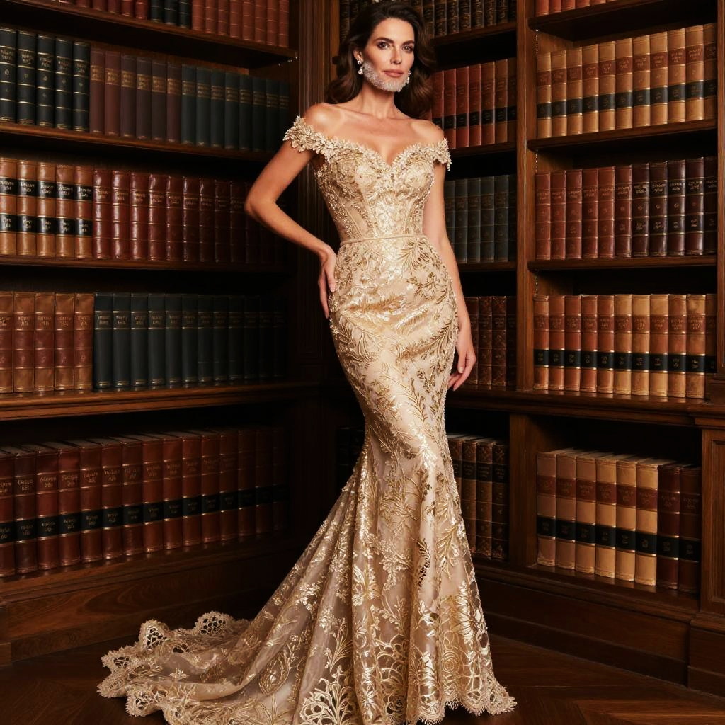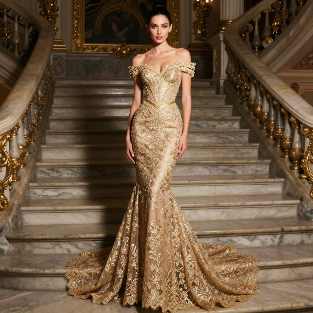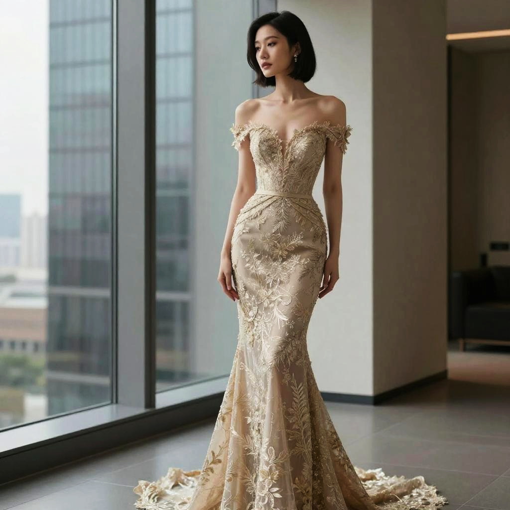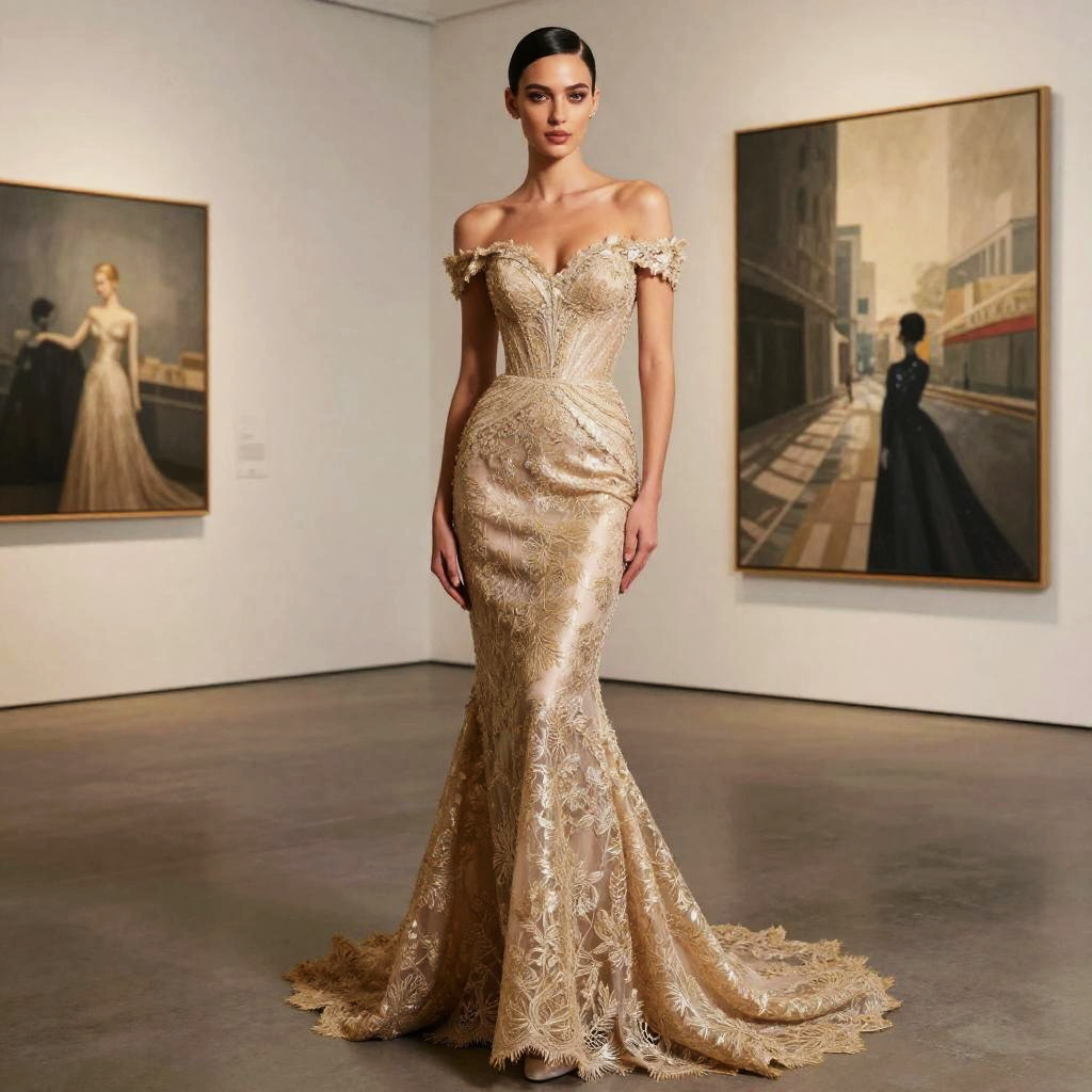 Mysterious woman wearing a vintage cloche hat in foggy Parisian alley, embodying noir cinematic drama, wearing a fitted nude mermaid gown with intricate metallic gold lace overlay, sweetheart neckline, off-the-shoulder cap sleeves; sculpted bodice and cinched waist; skirt flaring from knee to a sweeping floor-length hem; elegant pose, refined makeup, subtle jewelry, luxe fabric texture, soft diffusion with gentle rim light, photorealistic, high detail, editorial fashion vibe