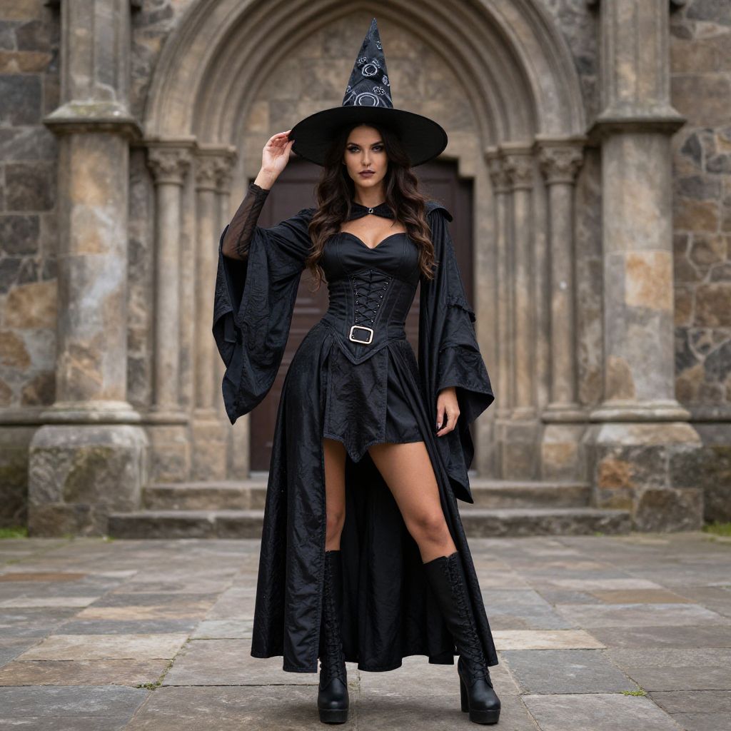 "Witch Guard Costume, woman in a witch costume standing in front of a stone building"