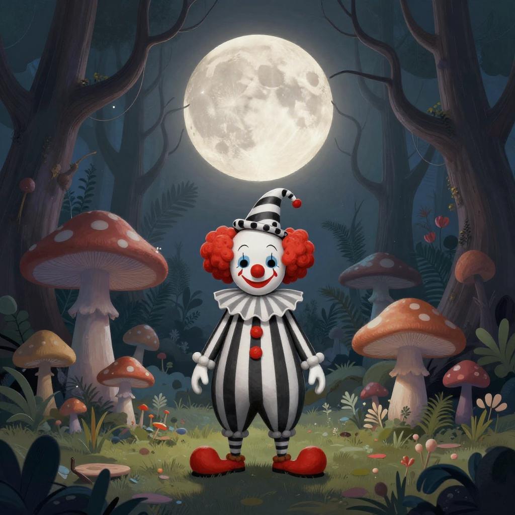 Digital illustration of a clown with red hair and a black and white striped outfit standing in a surreal enchanted forest under a large full moon. The clown wears a striped hat with polka dots and bright red accents. The forest is filled with stylized, colorful mushroom-like shapes and dark, twisted trees, creating a magical and slightly eerie atmosphere.