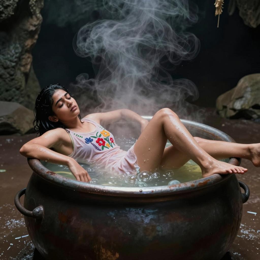 Embroidery Stitch Dictionary photorealistic 1980s, sleepy tired teenage Pooja Hegde in wet dress reclines in cauldron with a 6ft radius, 10 feet tall, full of bubbling steaming soup, scene set in a dark cave,