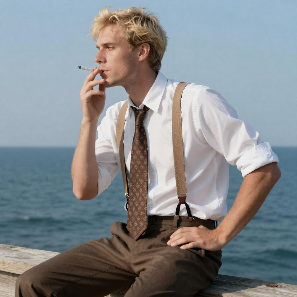 Blonde man with light skin, sitting on wooden plank, wearing white shirt, brown suspenders, and patterned tie, smoking cigarette, blue ocean background, clear sky, side profile, relaxed expression, hands on hips.